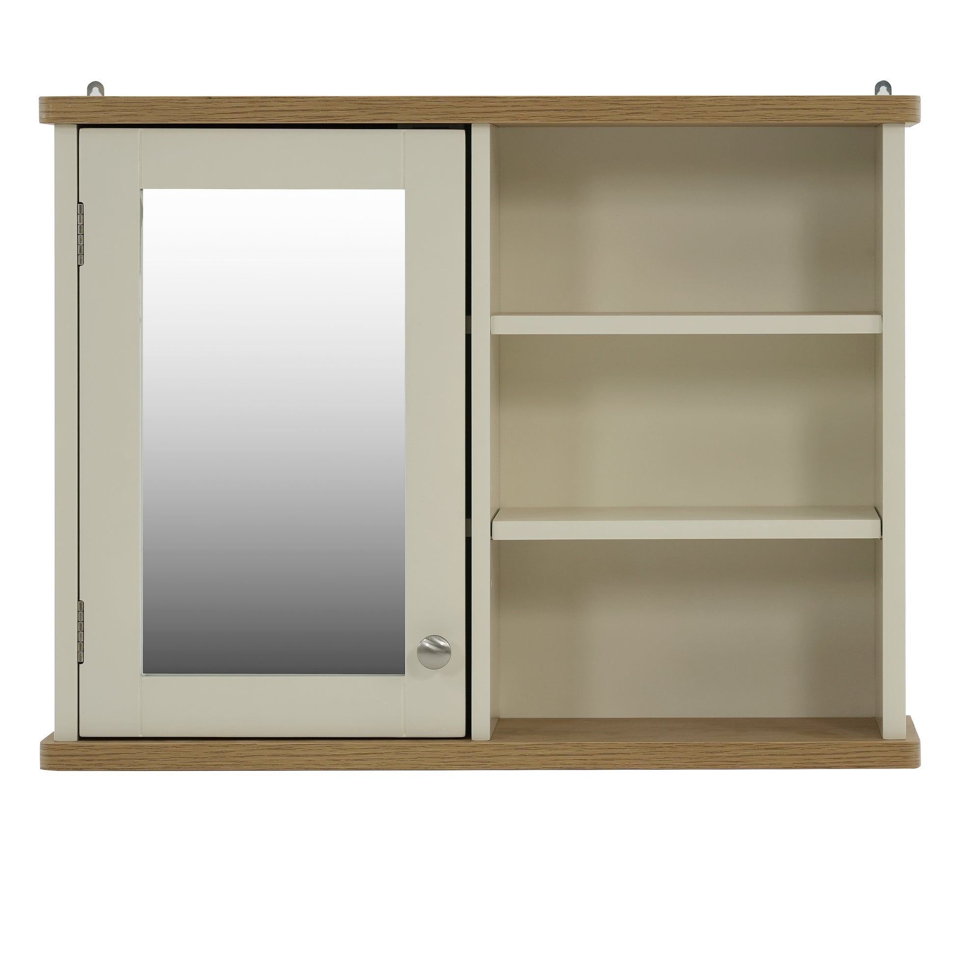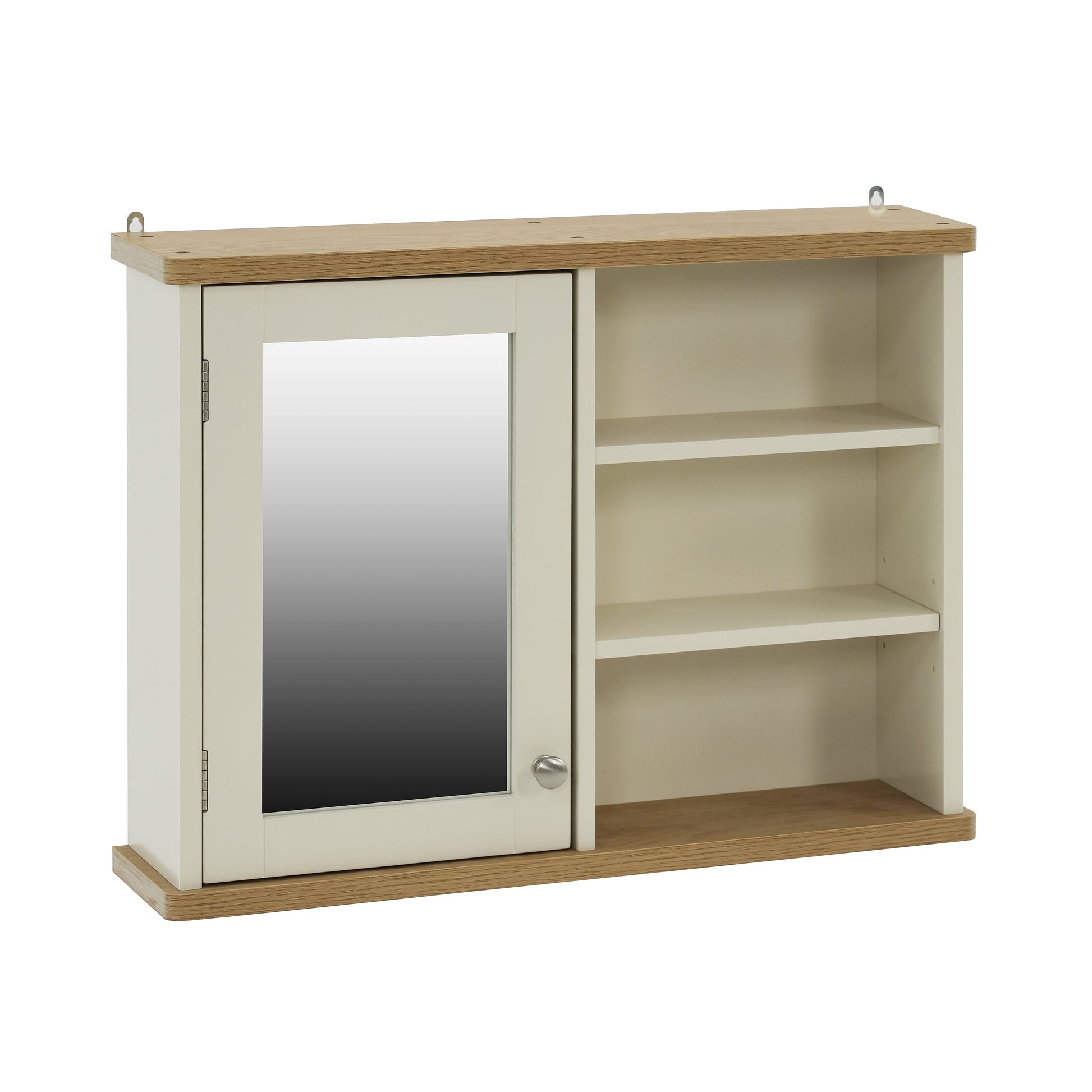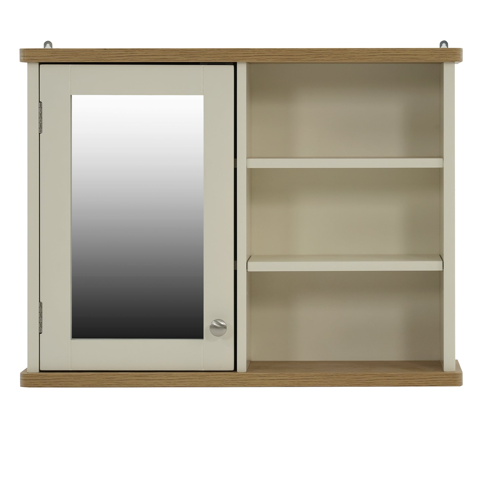 Part of our traditional two-tone country style, the Olivia bathroom mirror provides hidden and open storage with a mirror facility. This sturdy, quality wall unit comes in ivory with an oak effect top and base.