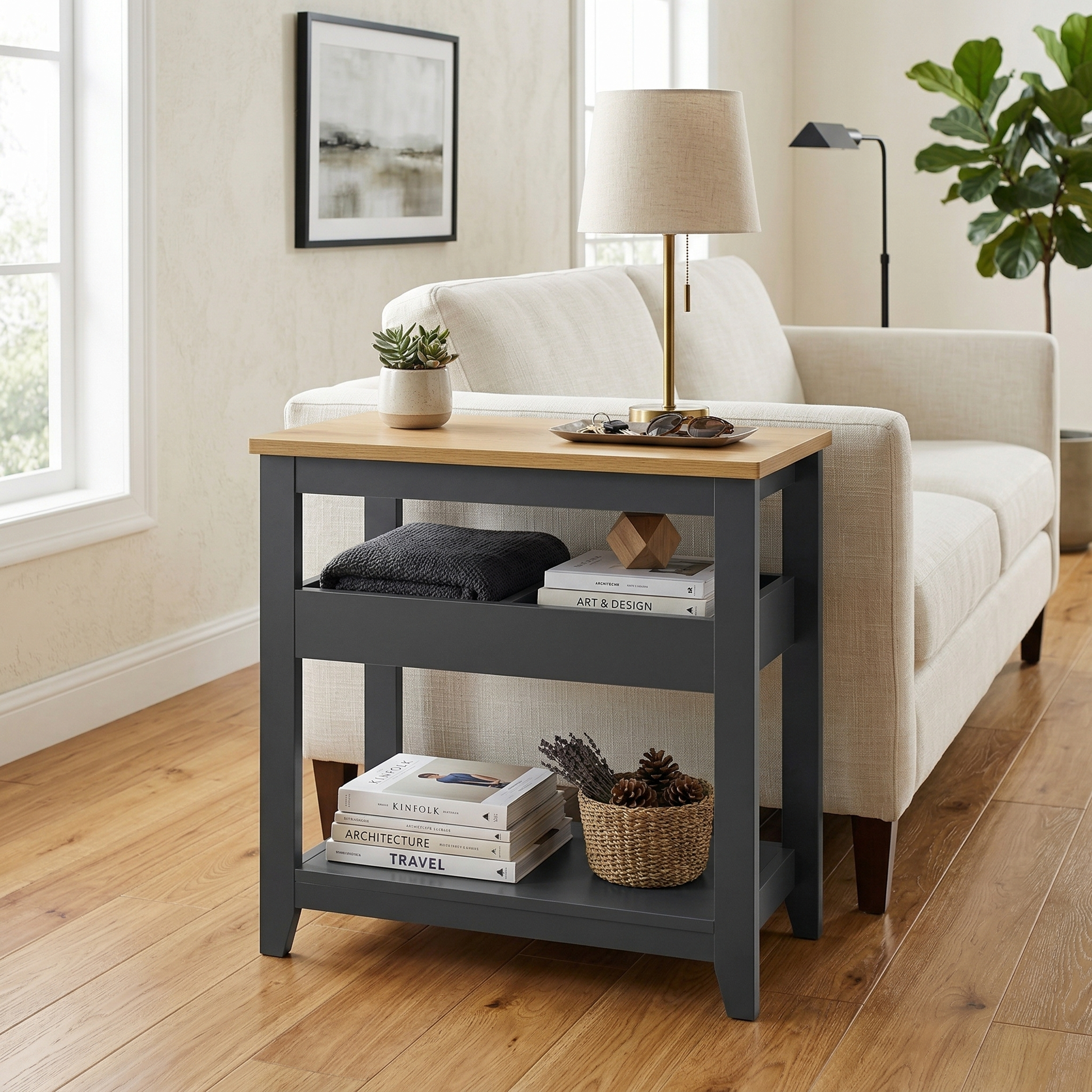 The Windsor Two-tone Collection offers a traditional cottage and farmhouse aesthetic. This Windsor Sofa Side Table has clean lines, a natural wood effect top, and a soft cream frame, designed to look warm, simple, and practical. This versatile sofa side table with ample storage spaces is crafted to sit at the ideal height beside your sofa, providing a convenient spot for your drinks, remote or any essentials you want within easy reach. It can also function as a space-saving table in a hallway, bedroom and various other rooms.